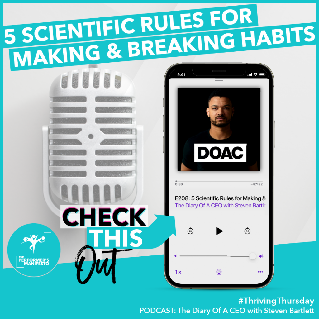 This #ThrivingThursday, we’re diving into a gem of a resource that’s perfect for anyone ready to take control of their creative journey. We’re talking about Episode 208 of Steven Bartlett’s “Diary of a CEO” podcast, titled “5 Scientific Rules for Making & Breaking Habits.” Why This Episode? As performers, we are the CEOs of our […]